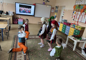 Zadanie 1. Spotkanie z twórcami kultury ludowej - zapoznawanie dzieci ze sztukę ludową, tradycjami i obrzędami charakterystycznymi dla swojego regionu. Dzieci poznały nasz opoczyński strój regionalny dla kobiety i mężczyzny, jego poszczególne elementy z poprawnym nazewnictwem, a także miały możliwość go założyć. Oglądały jak Zespół Pieśni i Tańca Mazowsze tańczy nasz taniec regionalny - oberek ( https://youtu.be/p6svoYBEWCs?t=5 ), a następnie samodzielnie odtwarzały jego elementy w zabawach muzyczno-ruchowych. Nauczyły się również jak wykonać wycinankę z papieru.