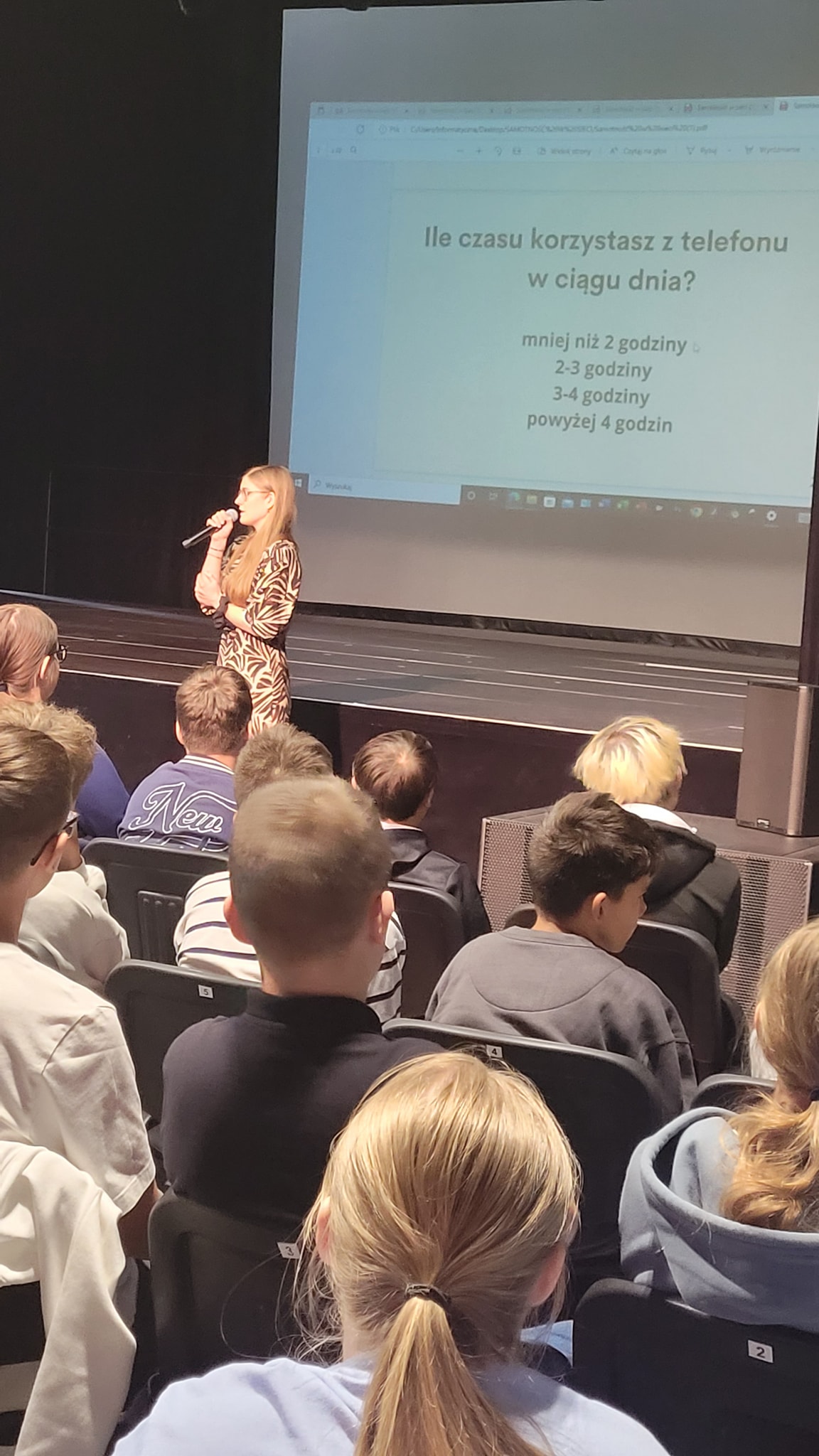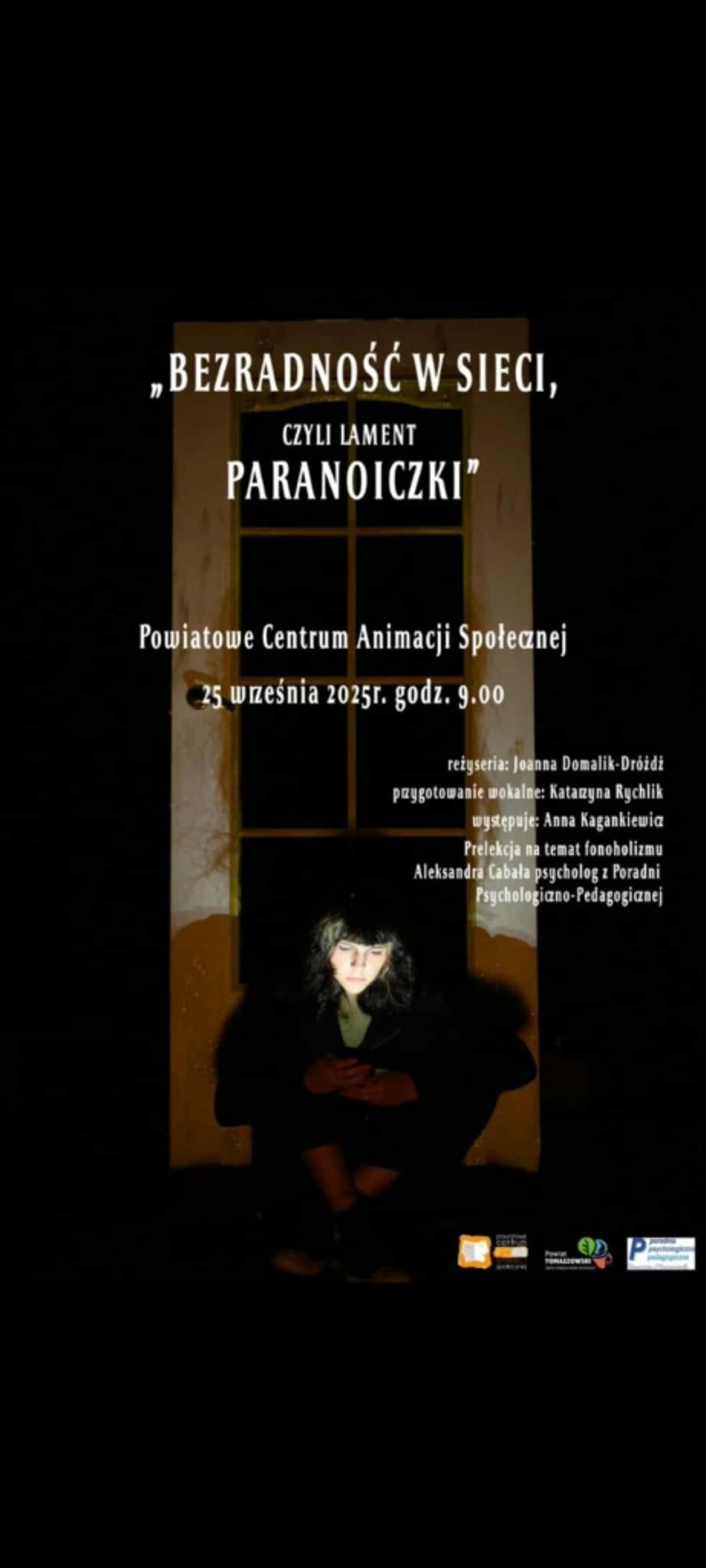 25 września uczniowie klas siódmych i ósmych uczestniczyli w monodramie pt. ,,Bezradność w sieci, czyli lament paranoiczki". Ukazuje on problemy, z którymi na co dzień zmagają się młodzi ludzie pochłonięci przez Internet, prowadzący niepostrzeżenie do uzależnień. Spektakl przygotowała grupa teatralna PCAS-u. W ramach spotkania odbyła się również pogadanka profilaktyczna na temat uzależnienia od smartfonów, mediów społecznościowych i treści internetowych , a także hejtu i sposobów radzenia sobie z nim. Prelegentką była pani Aleksandra Cabała, psycholog z Poradni Psychologiczno-Pedagogicznej w Tomaszowie Mazowieckim.