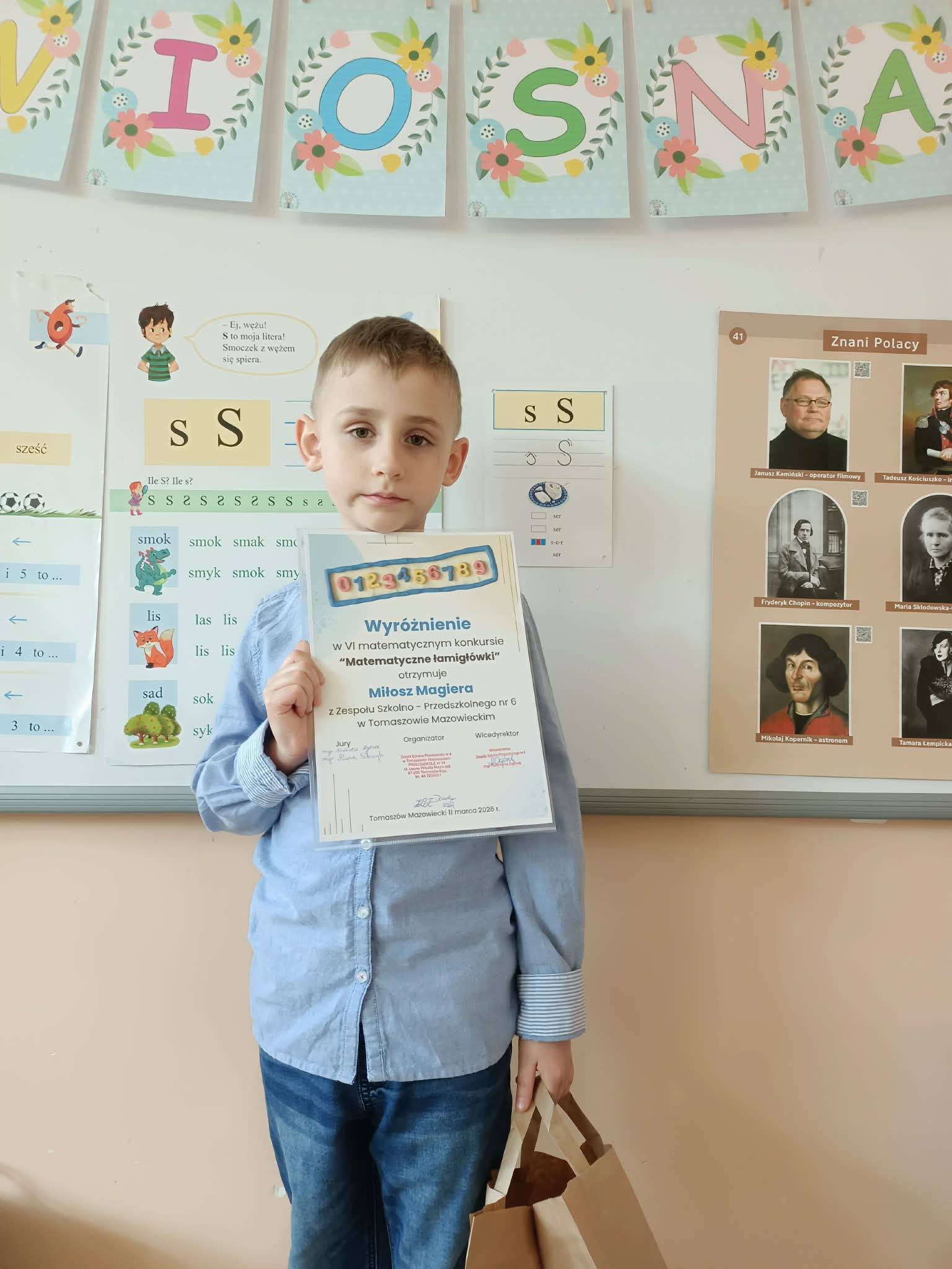 Uczeń klasy 0 Miłosz Magiera zdobył wyróżnienie w VI międzyprzedszkolnym konkursie "Matematyczne łamigłówki". Serdecznie gratulujemy i życzymy dalszych sukcesów oraz wielu radości z odkrywania świata matematyki!