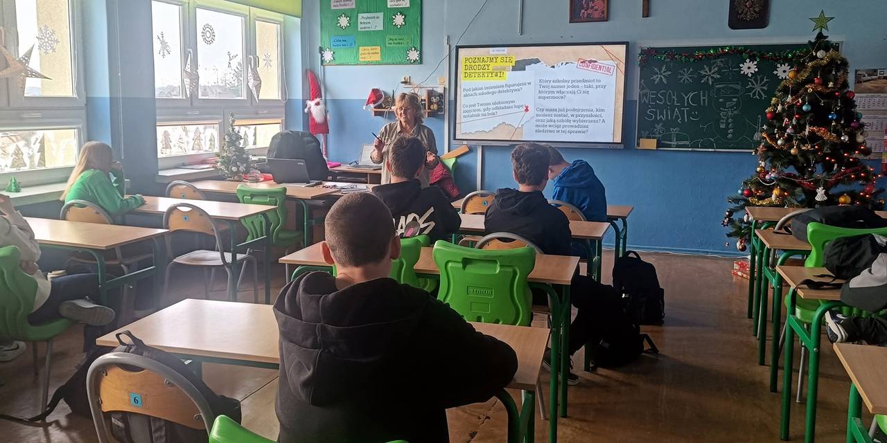 W styczniu odbyły się zajęcia z zakresu doradztwa zawodowego dla uczniów klas ósmych. Warsztaty pod hasłem "Zawodowy detektyw na tropie ścieżki edukacyjno-zawodowej" zostały przeprowadzone przez doradców zawodowych z Młodzieżowego Centrum Kariery OHP w Tomaszowie Mazowieckim. Uczniowie wcielili się w rolę detektywów, odkrywając tajemnice różnych zawodów oraz poznając możliwe ścieżki edukacyjne. Rozmawiali o swoich pasjach i zainteresowaniach, brali udział w drużynowych zabawach, lepiej poznawali siebie oraz swoich rówieśników. Były to wyjątkowe, inspirujące zajęcia, które z pewnością pomogą uczniom w podejmowaniu przyszłych decyzji edukacyjno-zawodowych.
